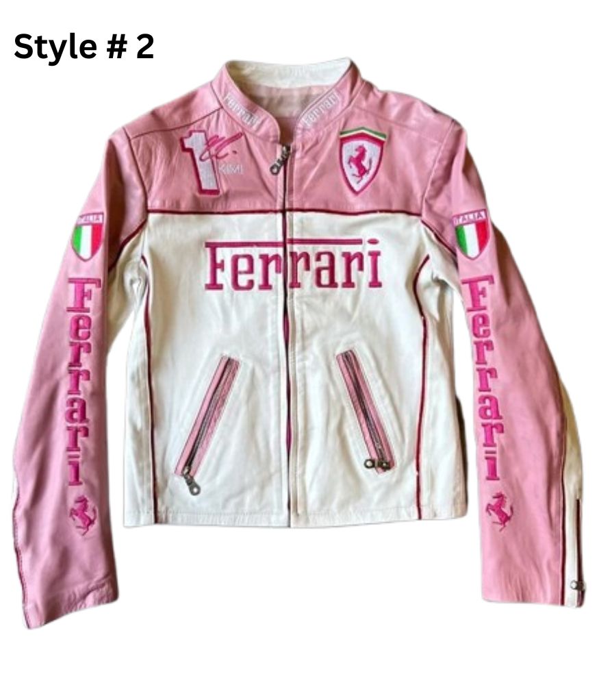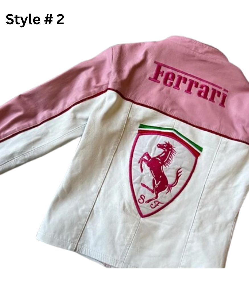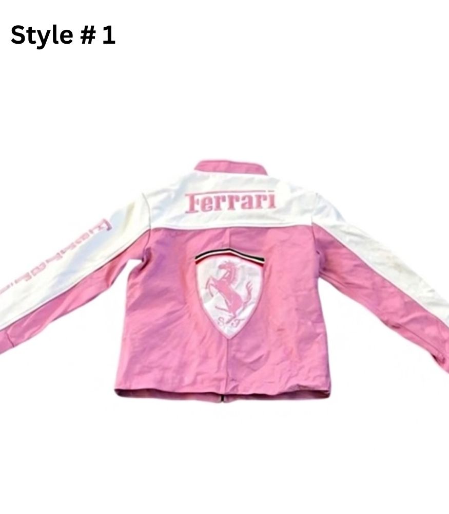 Introducing Ferrari Pink Racing Leather Jacket This is a quality and durable product with mesh faux-leather and mesh or leather and a sun-resting lining. Style 1 has open hem cuffs for a fresh finish; Style 2’s has a zip for an edge. The stand-up collar and zipper closure give it its modern lines. Providing one of the most colorful styles available, this pink-and-white scheme is a great choice for racers and stylish people or humans in general.