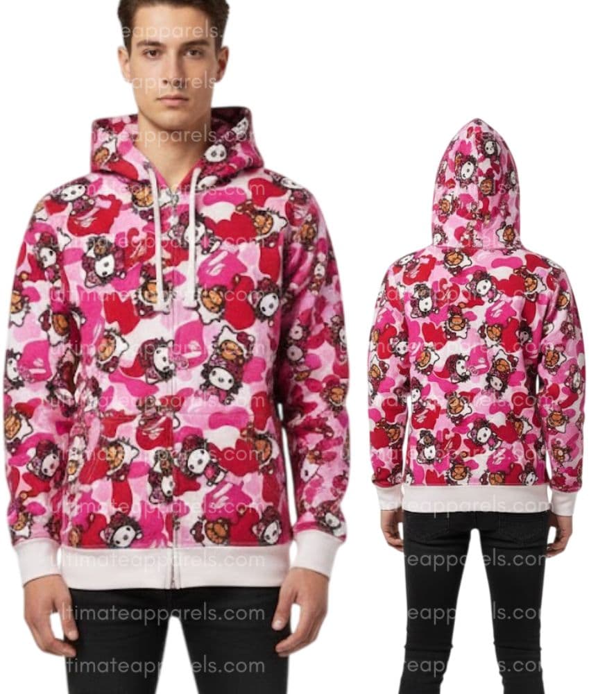 Inspired by the playful appeal of Hello Kitty and the urban edge of BAPE the Hello Kitty BAPE Hoodie is a must for fans of pop culture and urban fashion. This hoodie weaves together the classic appeal of the character with the present-day cool of BAPE’s exclusive designs. Perfect for casual days out, social events, or even movie nights that feature animated classics or pop culture-themed films, this hoodie brings a fun and fashionable statement to your wardrobe. It does well with jeans, joggers or skirts the bright pink color and BAPE camo details make it a versatile piece for men and women who like to stand out.