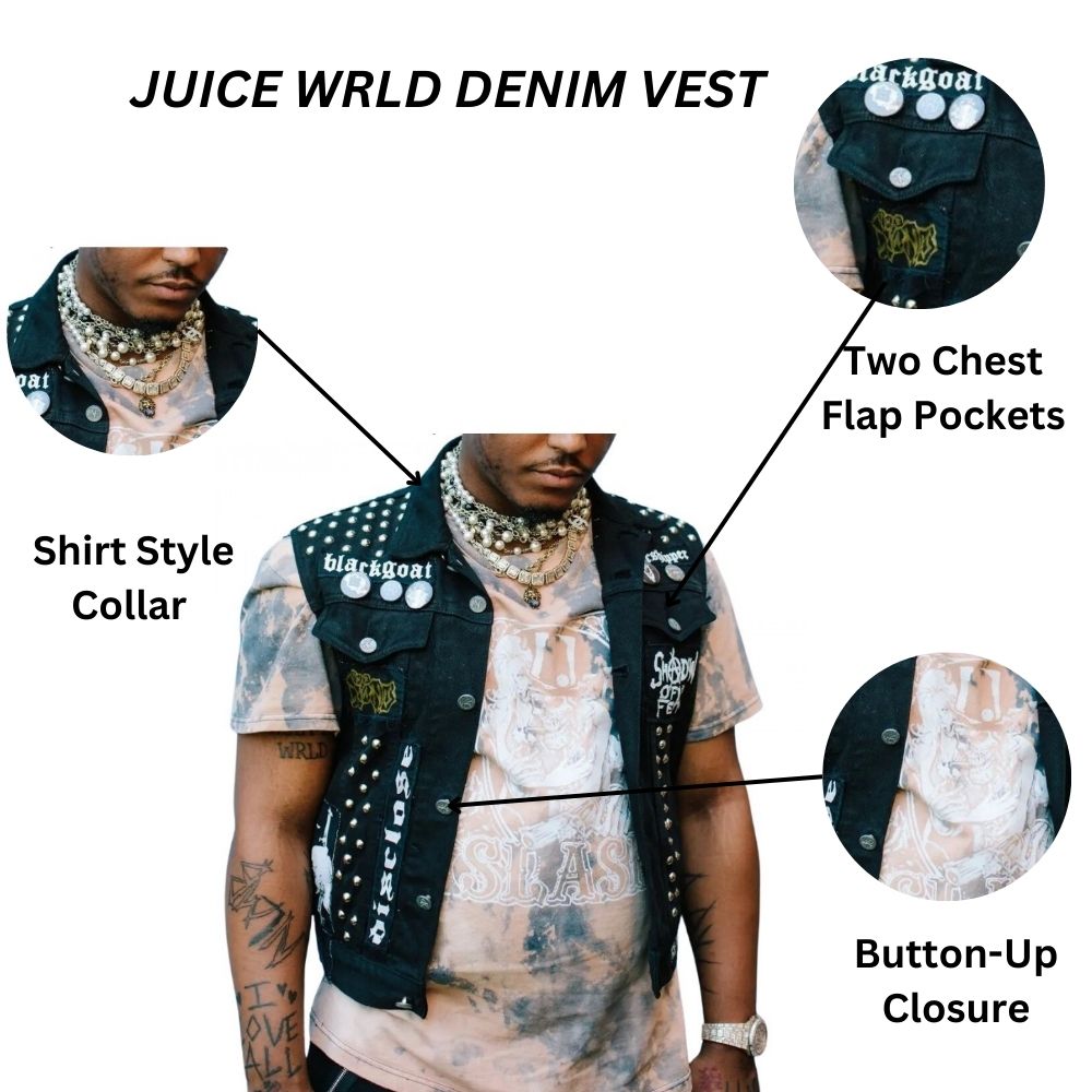 Dressed in black denim with a soft viscose lining, this Black Denim Studded Vest we present to you in classic black. It features a full button-up front, a shirt-style collar and is sleeveless, which is great for layering. We have used fine stitching for extra durability and added two button-down chest pockets, which also look good. The vest also has a studded design, which we have put together with Juice WRLD inspired graphics to make the Juice WRLD Patch Vest, which is perfect for concerts, music festivals, streetwear, casual days out or fan events that require a statement look.