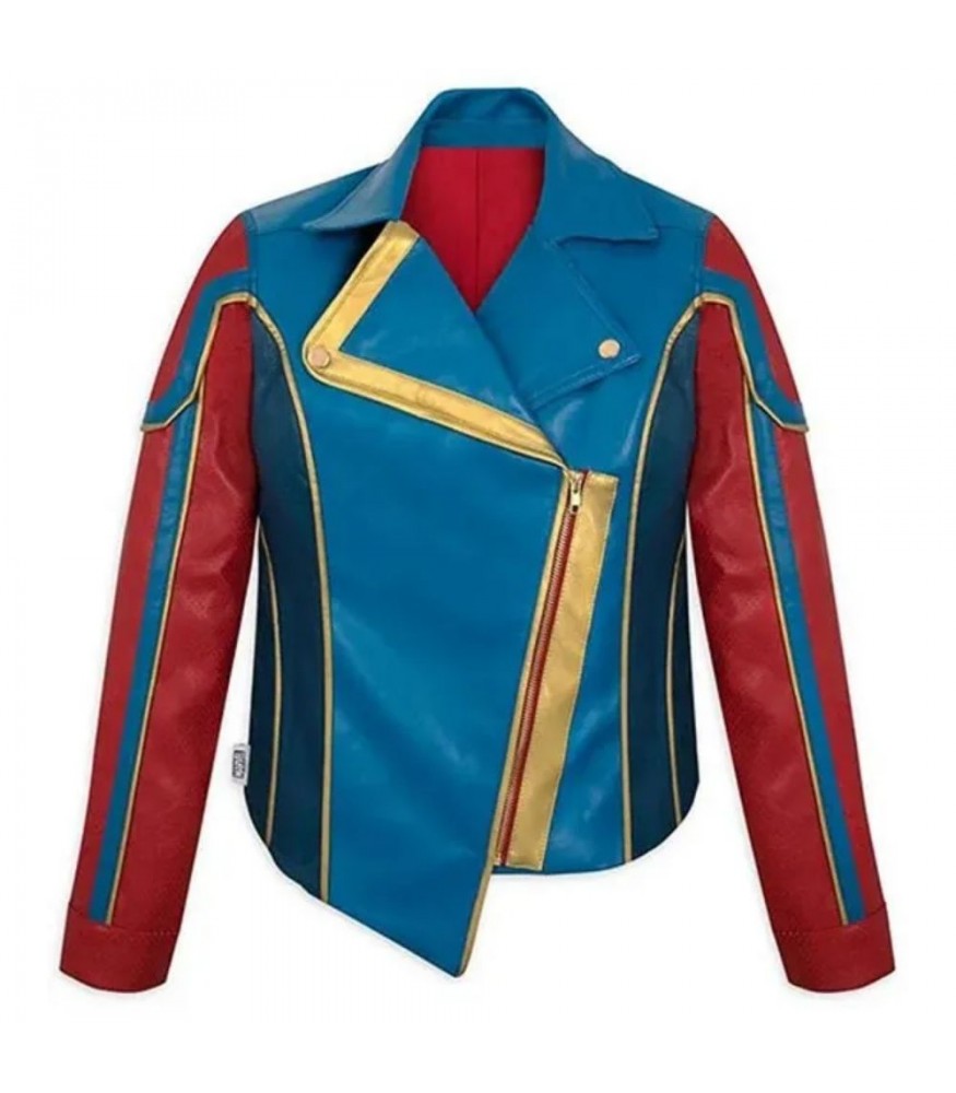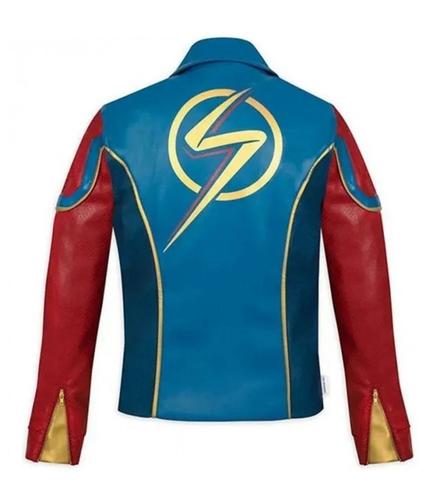 Distinctive Design: The jacket features a striking asymmetrical front zipper closure, providing a bold and edgy appearance. The signature lightning bolt emblem on the chest pays homage to Ms. Marvel's iconic symbol.