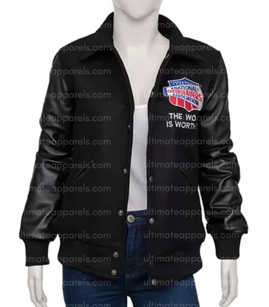 This jacket is visually striking because, as I have said before, the timeless black base with leather sleeves is both contrasting and elegant, which radiates sportiness. In addition, the chest has an NCA National Champion emblem, which celebrates the wearer’s association with the event. Also, the snap-button front closure functions practically while paying homage to classic varsity jackets. Thus, it makes wearing and removing the jacket effortless.