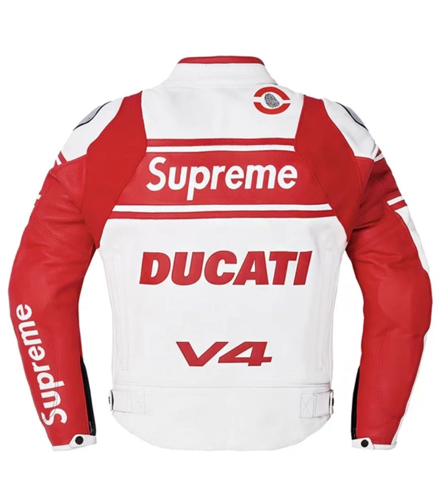 The Supreme x Ducati Motorcycle Racing Jacket has sleek style combined with premium performance. The jacket is made from your choice of real or faux leather, assembled with a strong outer layer and a comfortable viscose lining. This piece boasts an erect collar and full-length sleeves due to its racing inspiration.A secure zipper closure and practical pockets—two outside and two inside—improve functionality. Whether racing on the track or cruising down the street, this jacket has you riding in style and comfort.