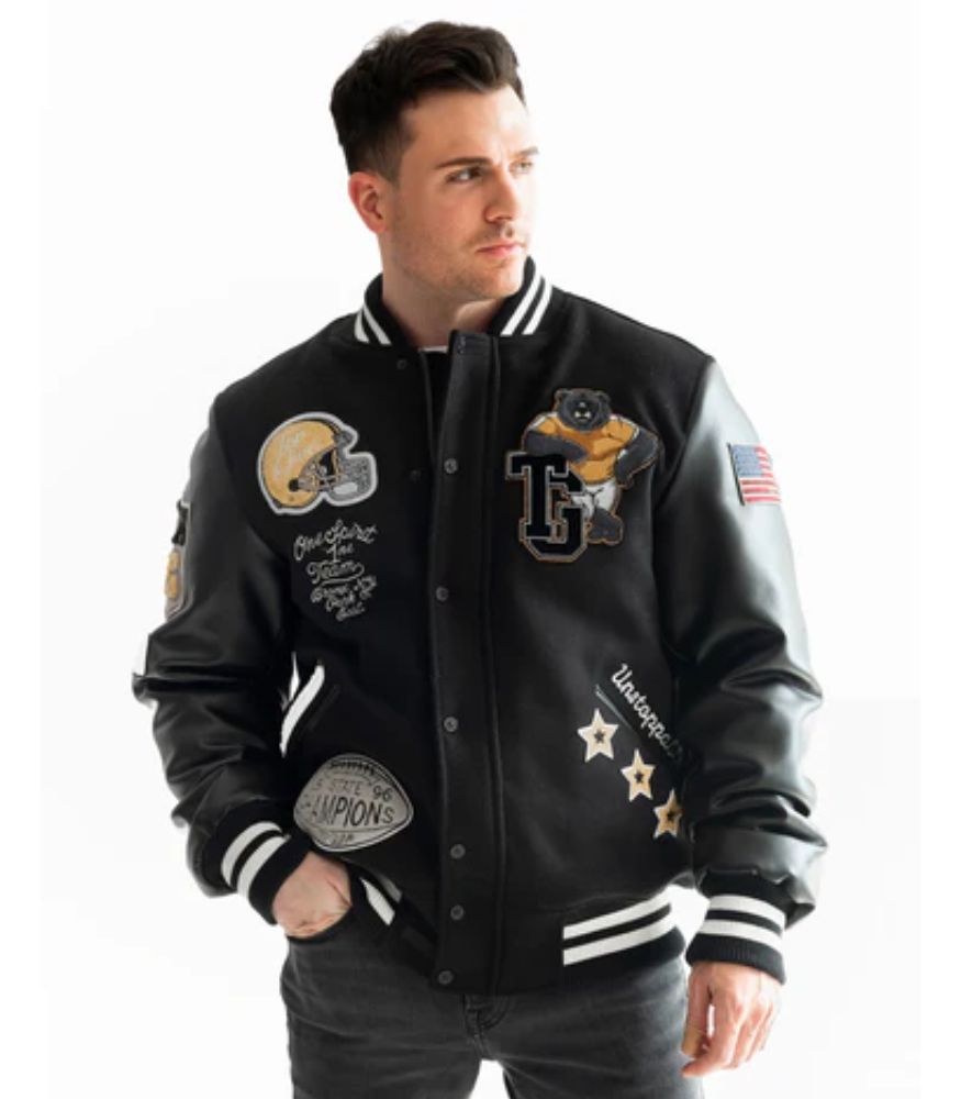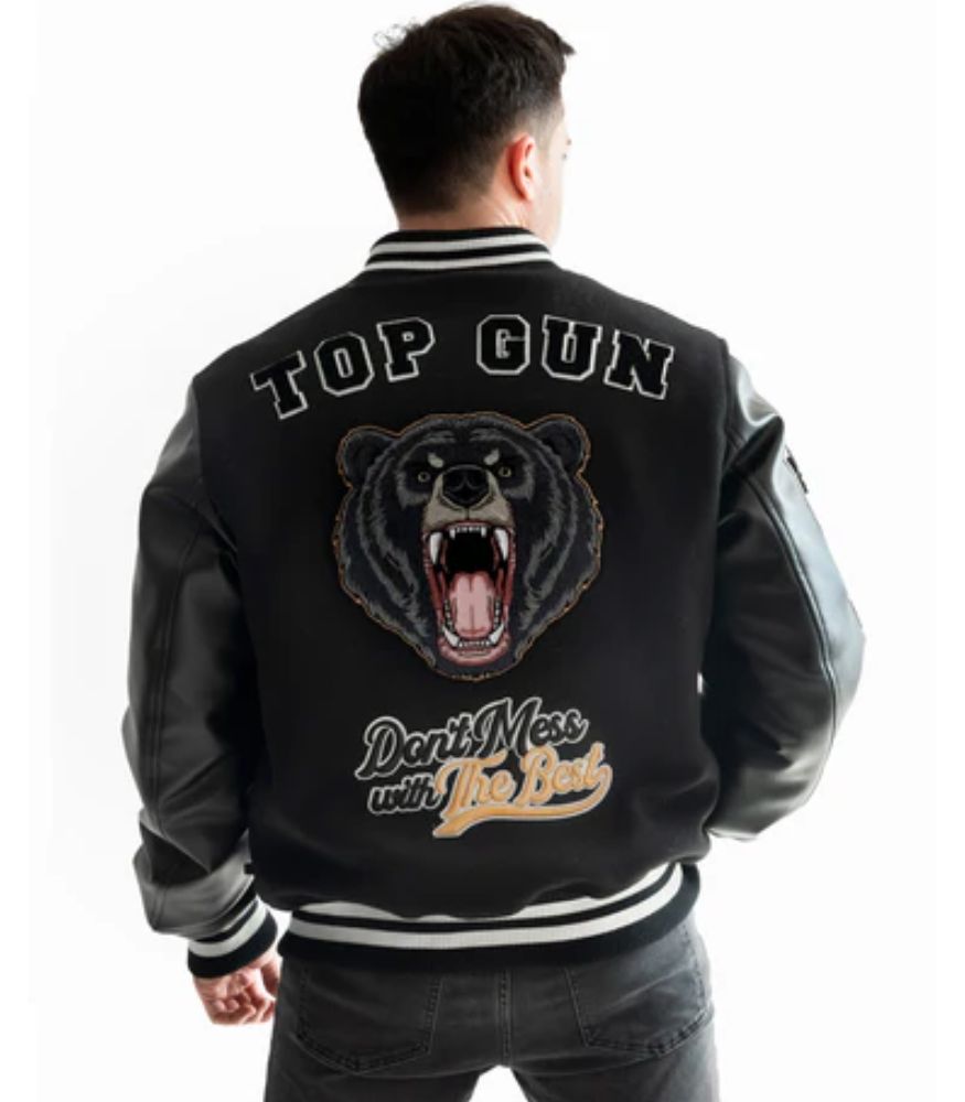 Top Gun Bears Varsity Jacket : This is for the ultimate blend of rugged appeal and classic varsity feel; the jacket is made with premium wool that features leather sleeves for warmth without sacrificing on durability.The rib-knitted collar and cuffs provide a fitted feel, while the snap-tap buttoned opening is classic. With two roomy waist pockets, it’s practical and chic. Be it unlocking your inner Maverick or making a statement, this black varsity jacket has you covered.