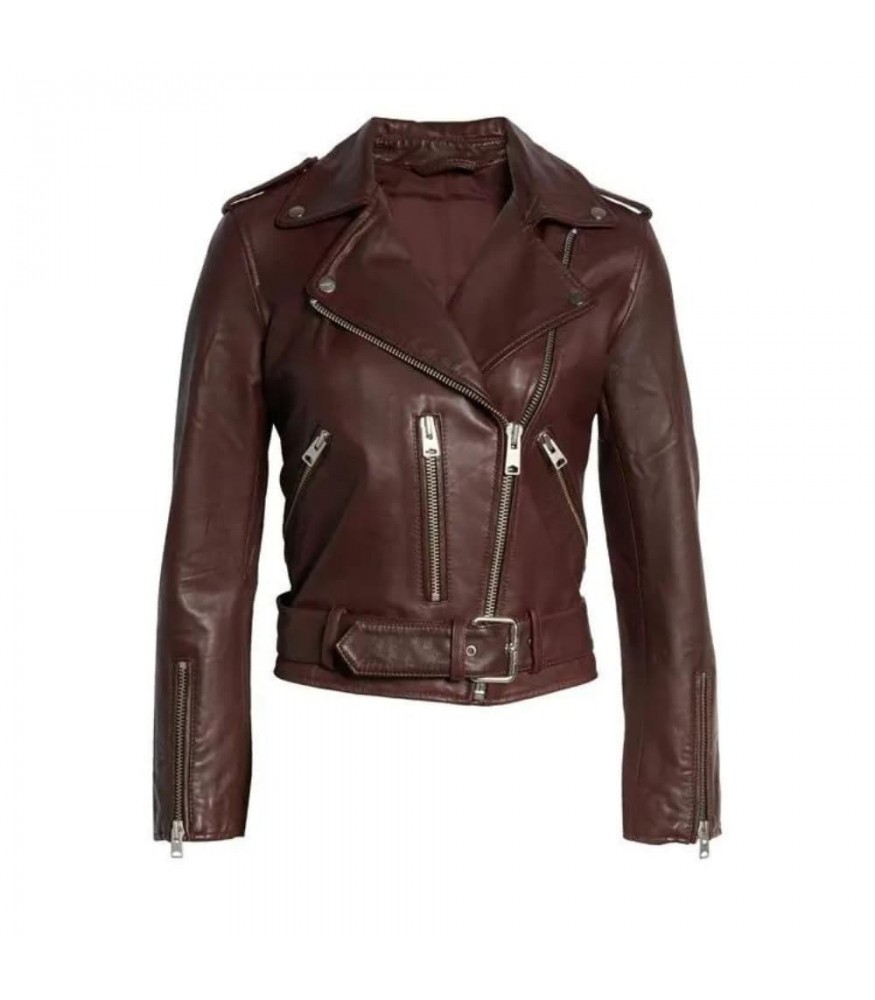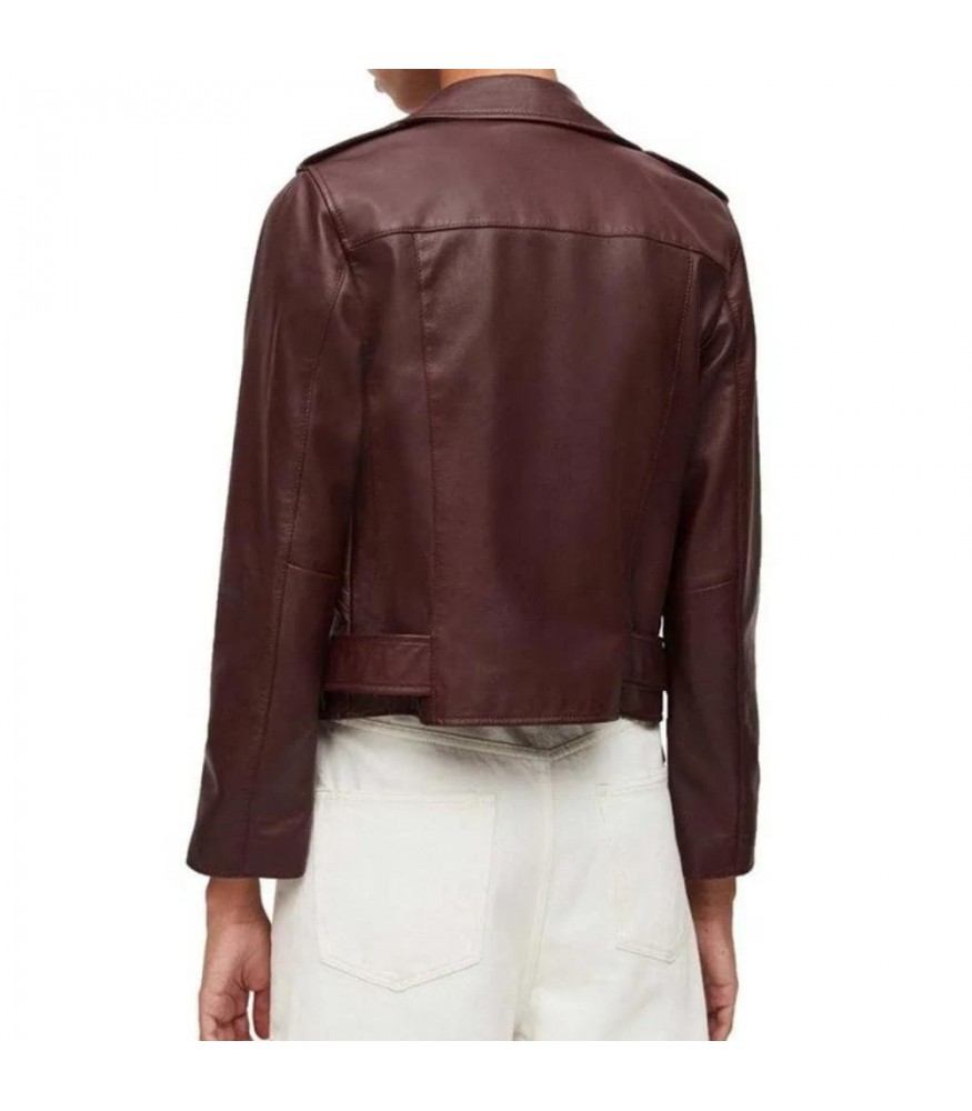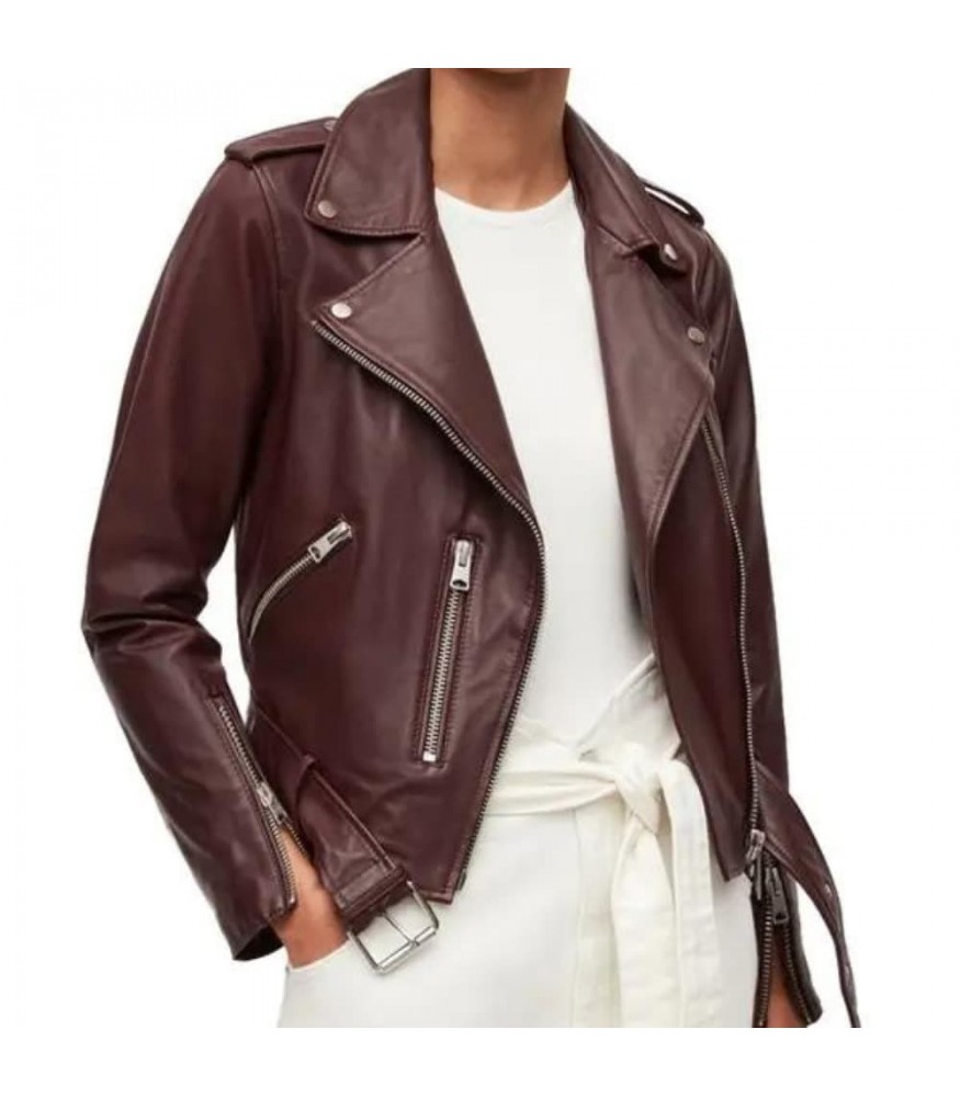 Immerse yourself in the enchanting landscapes of Virgin River with the Brie Sheridan Maroon Biker Leather Jacket, a harmonious blend of boldness and elegance inspired by the character's captivating style in the series.