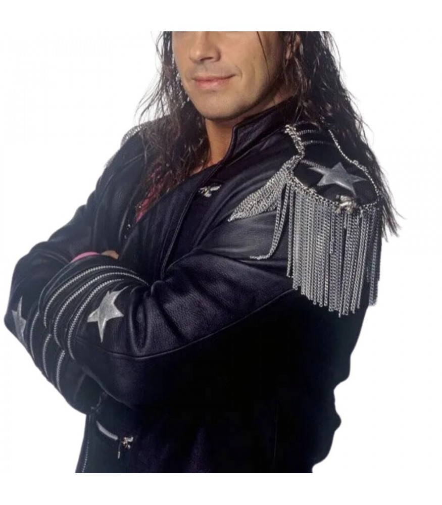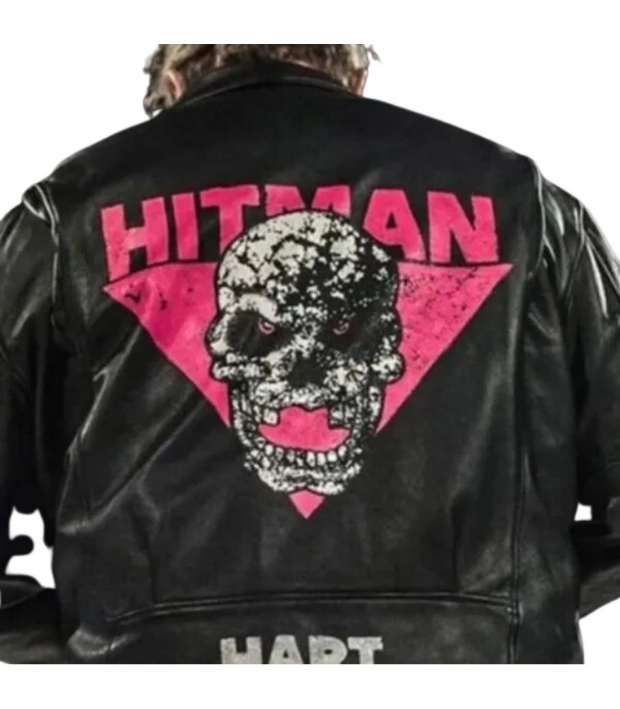 WWE Bret Hart Hitman Pink Stripes Black Jacket This is the legendary jacket of the legendary Bret Hart. The pink striped patterns and the star logo on the sleeves really take us back to the good ol...