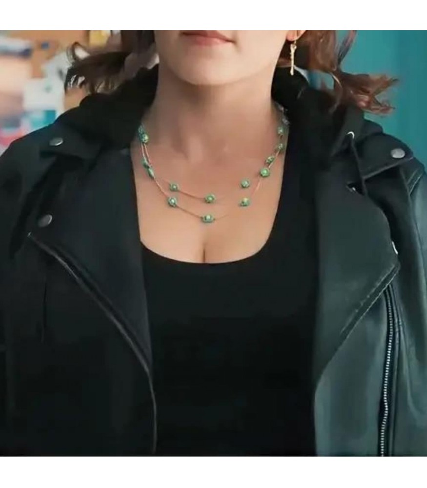 Empowering Scarlet Hue: Cloaked in an empowering scarlet hue, this black leather jacket emanates a bold and vibrant energy. The distinctive color, inspired by Rachel Bloom's character, makes a confident statement, symbolizing a fusion of strength and glamour.